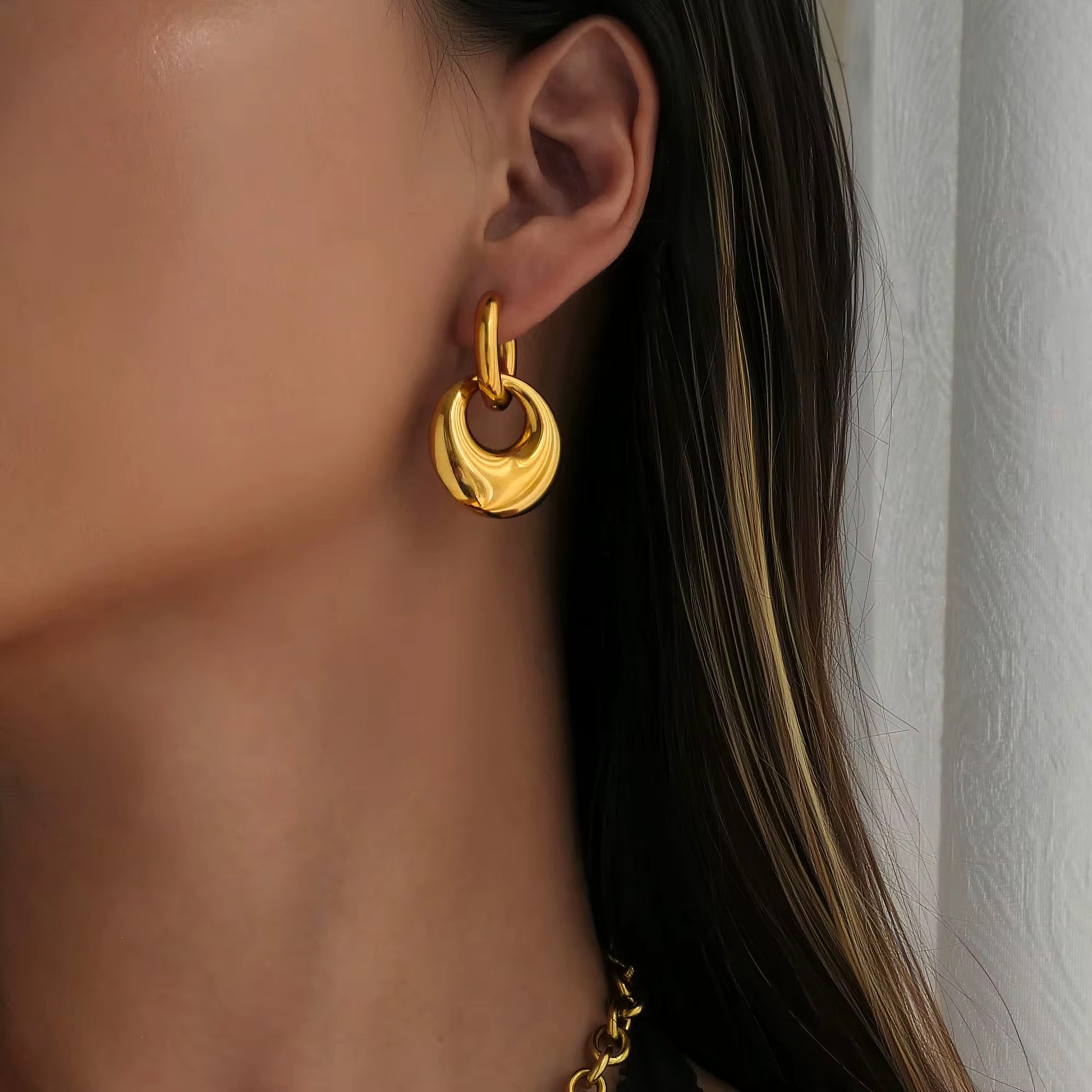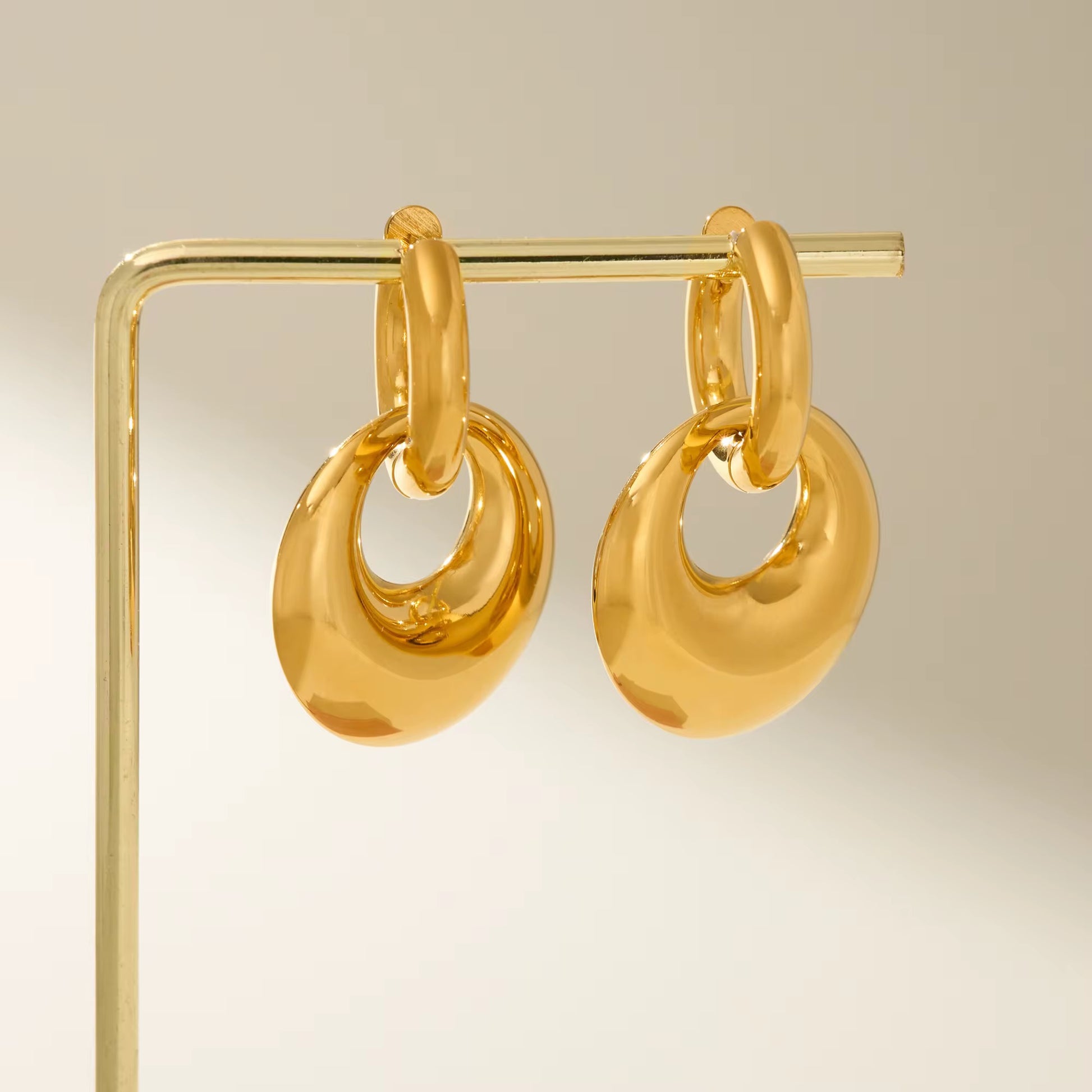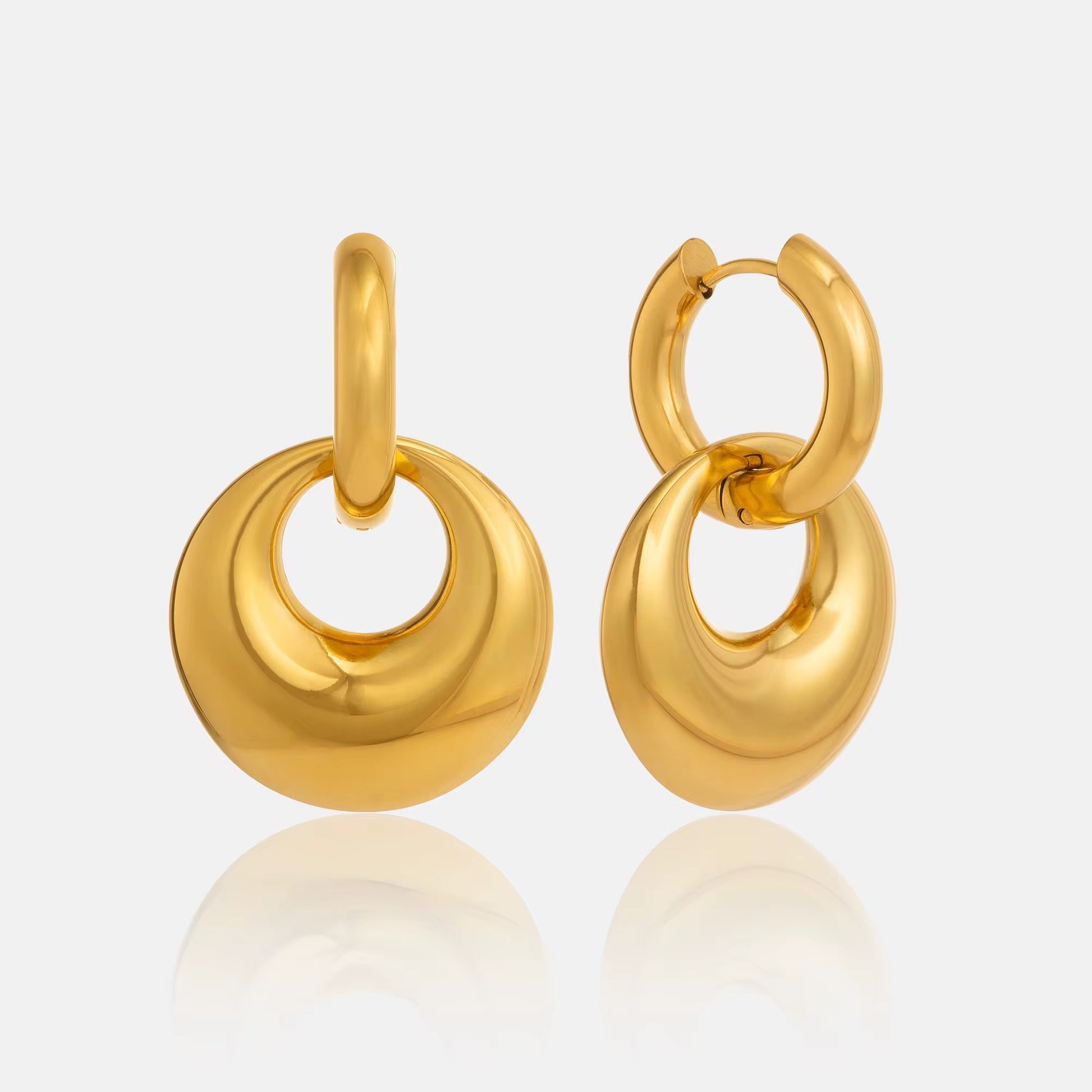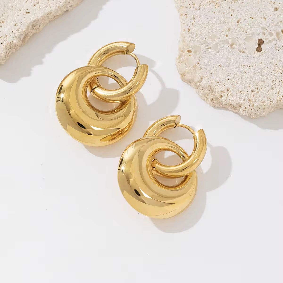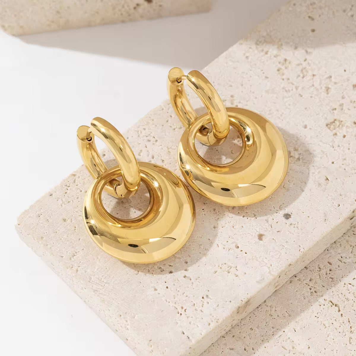 Elegantes aretes Rhea de diseño vintage con doble círculo chapado en oro 18k. Fabricados en acero inoxidable hipoalergénico, estos pendientes sofisticados combinan durabilidad y estilo atemporal para complementar tanto atuendos casuales como formales, sin causar irritación en pieles sensibles.
