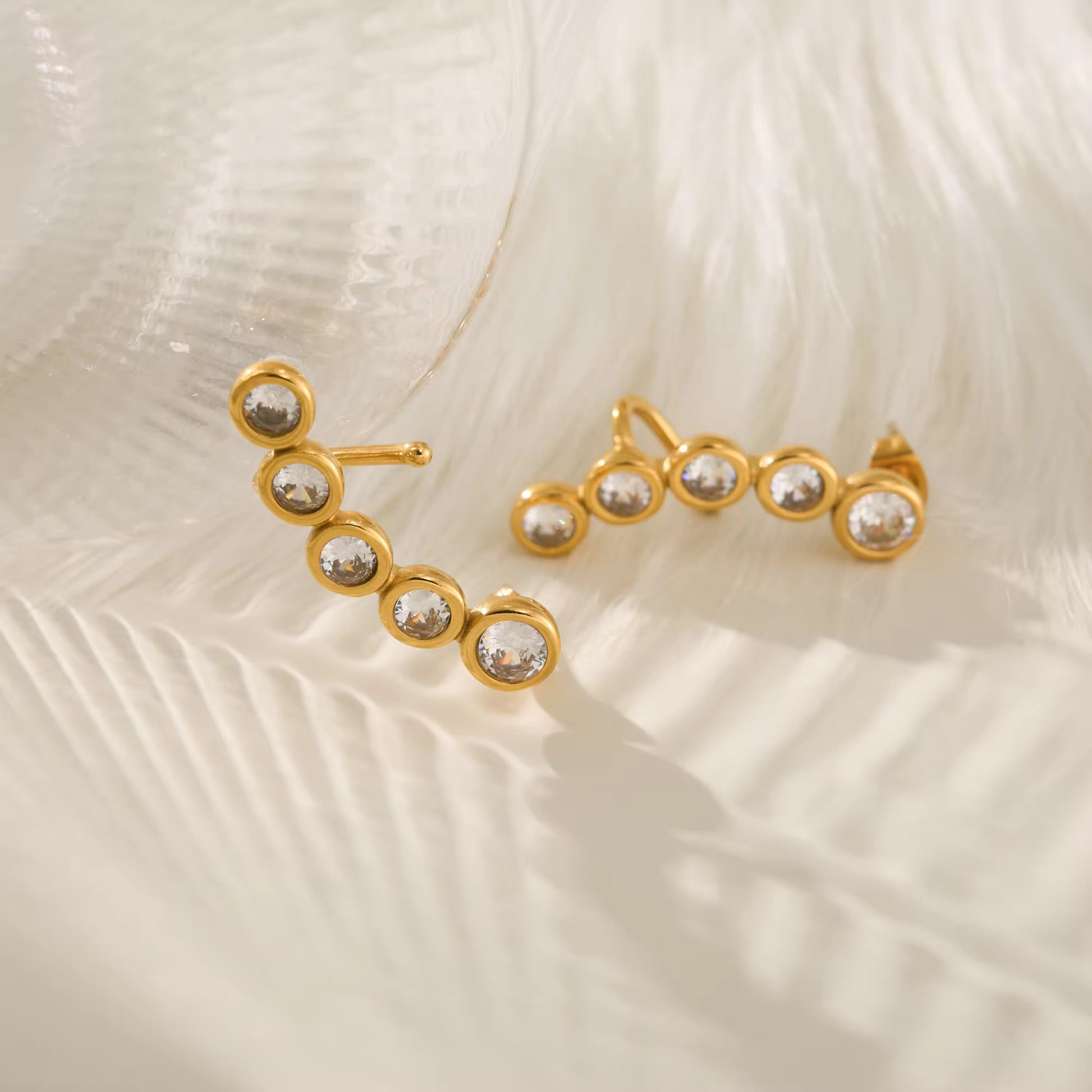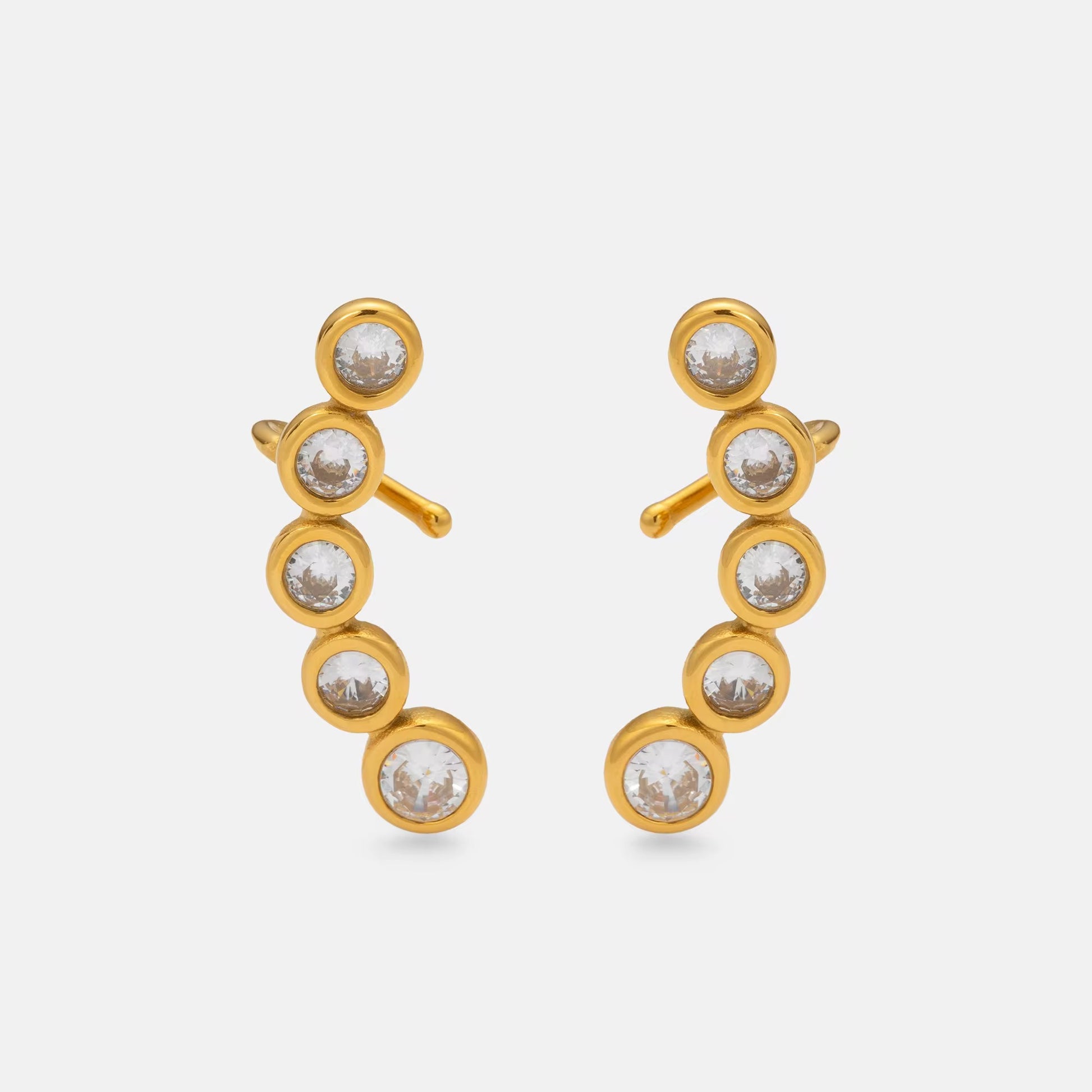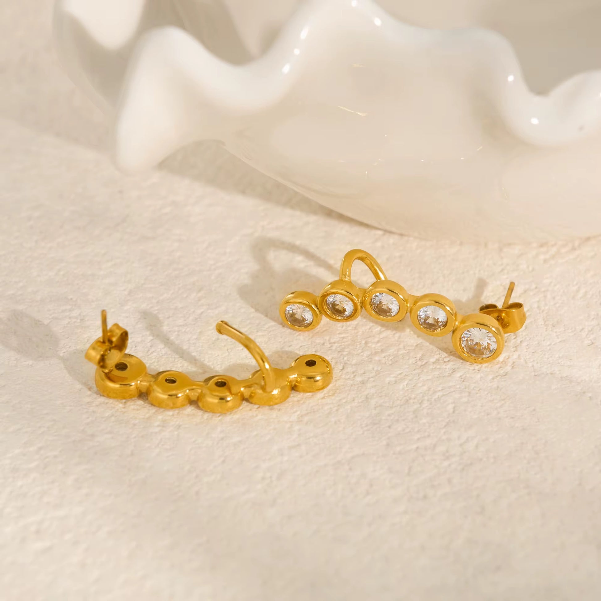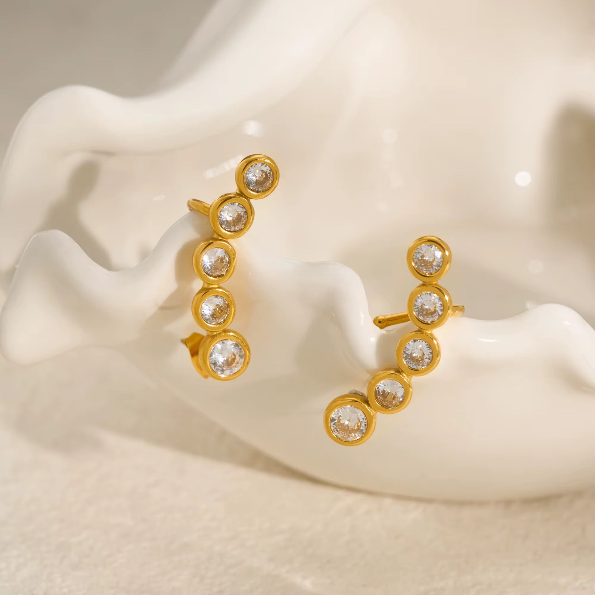 Elegantly crafted CURVE earrings feature vintage pear-shaped zircon stones with DOP certification, set in premium 18K PVD gold-plated stainless steel. This sophisticated design combines timeless appeal with modern durability, offering a luxurious accent to both everyday and special occasion ensembles.