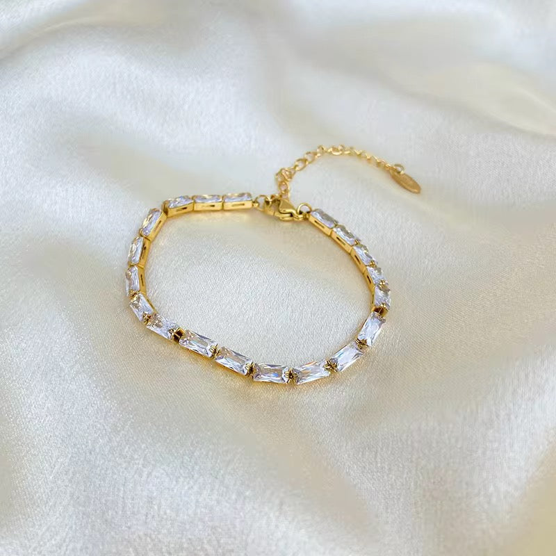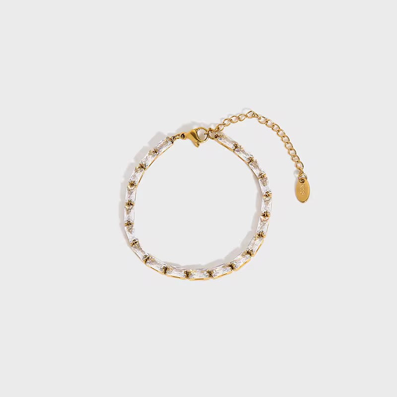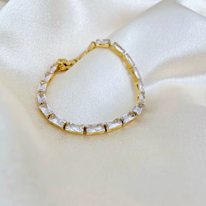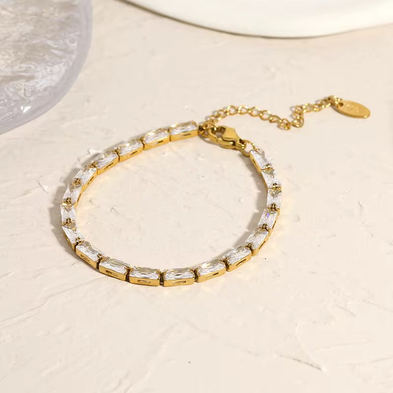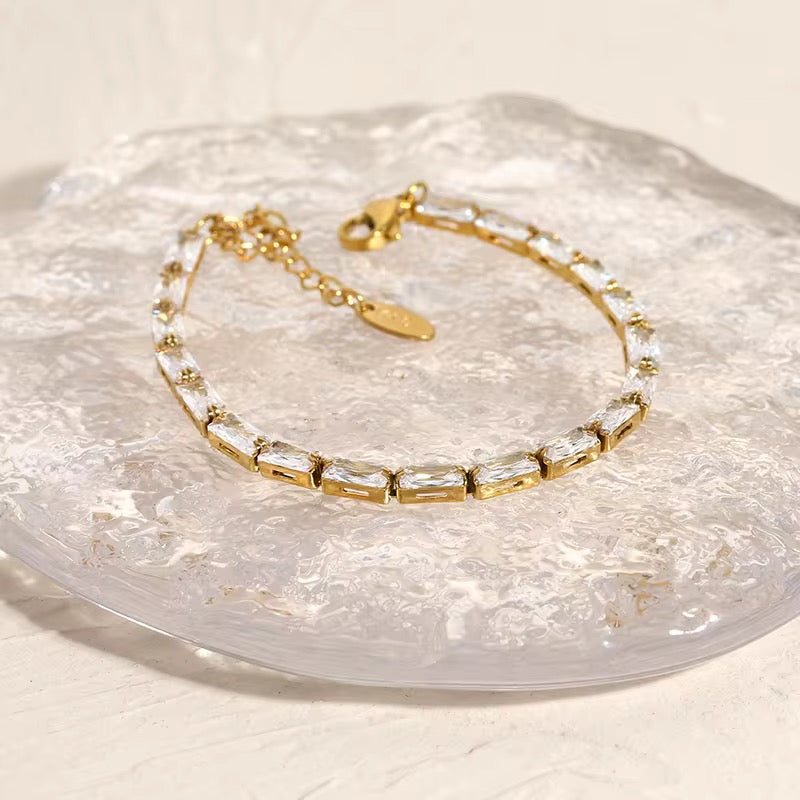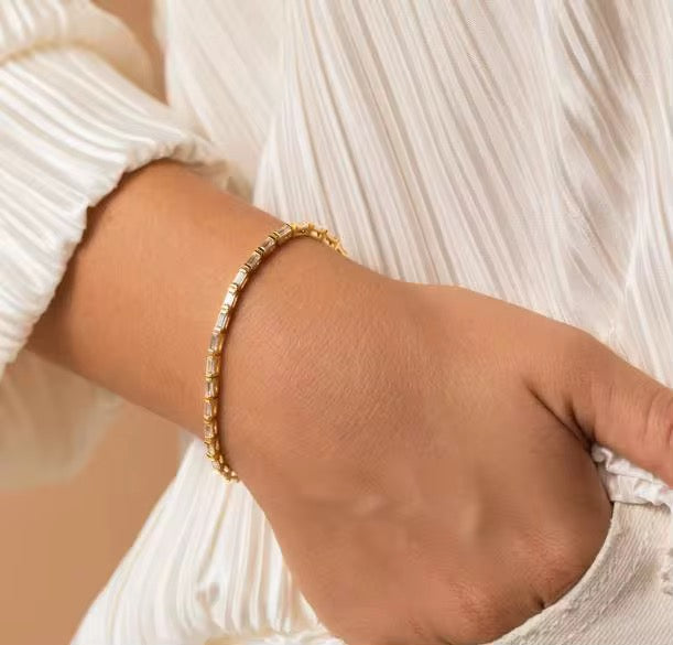 Elegante pulsera Liora chapada en oro sobre acero inoxidable con diseño de cadena de tenis. Incorpora circonitas de alta calidad que aportan un brillo excepcional. Su composición garantiza resistencia al deslustre, manteniendo su apariencia impecable con el paso del tiempo. Ideal para complementar tanto looks casuales como formales.