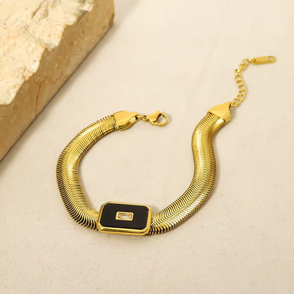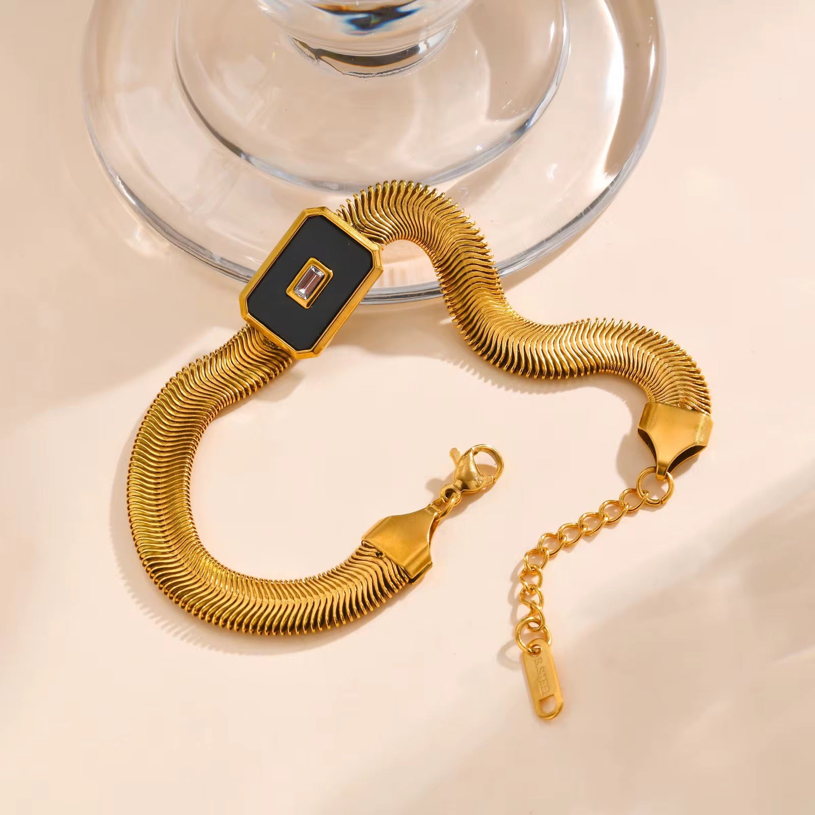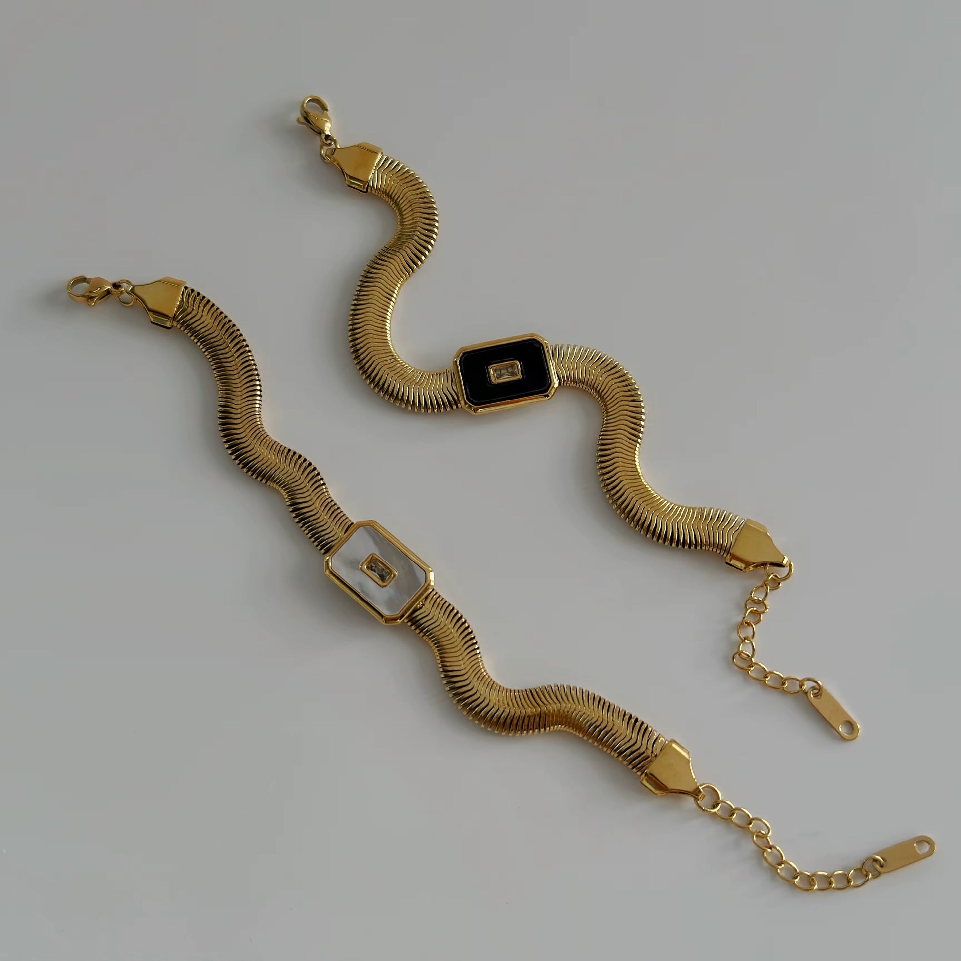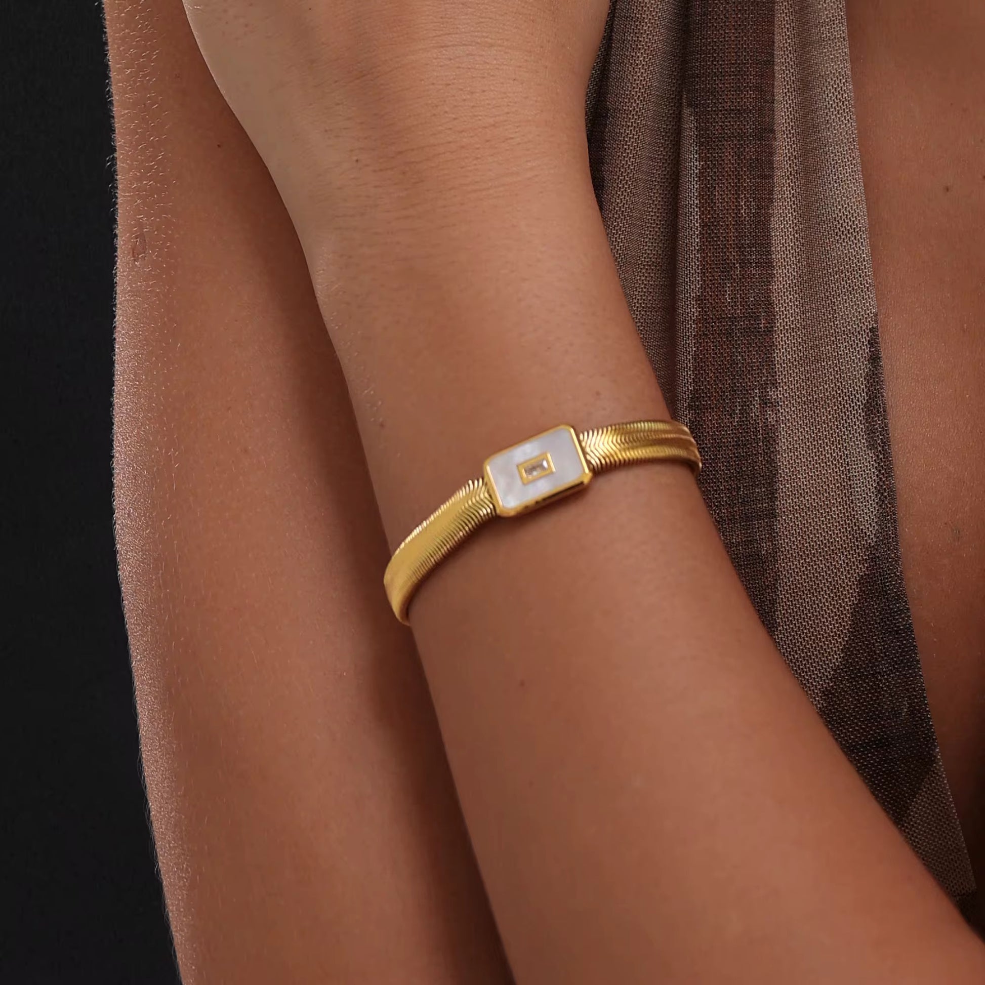 Brazalete de acero inoxidable chapado en oro de 18k que combina durabilidad excepcional con elegancia sofisticada. Fabricado con materiales de alta calidad para garantizar resistencia a la corrosión y decoloración, manteniendo su brillo dorado por más tiempo. Una pieza versátil que complementa tanto atuendos casuales como formales.