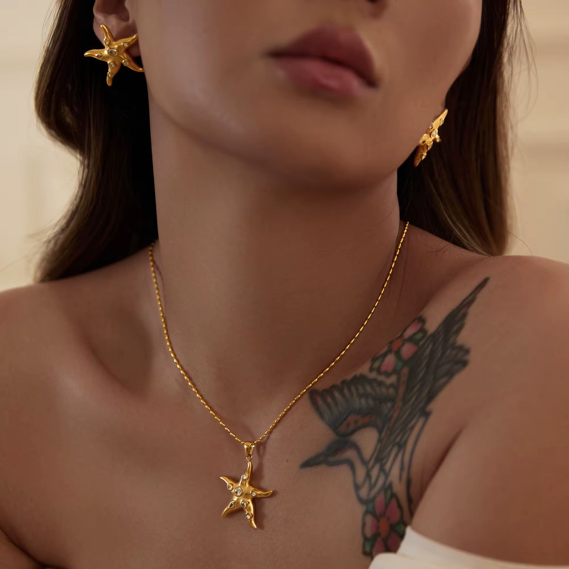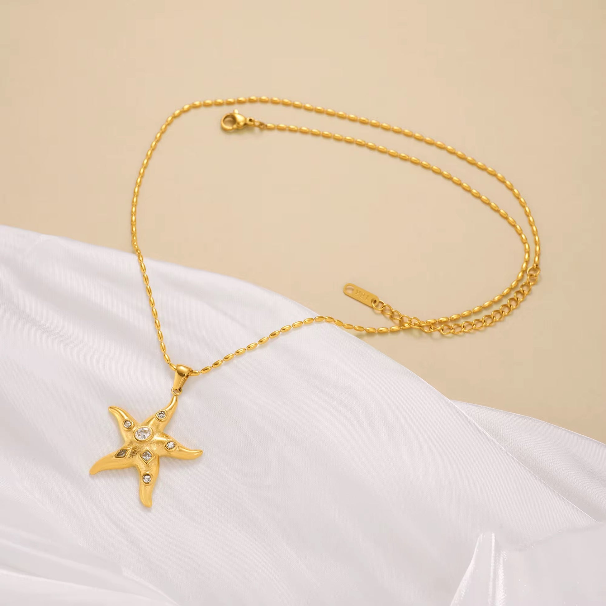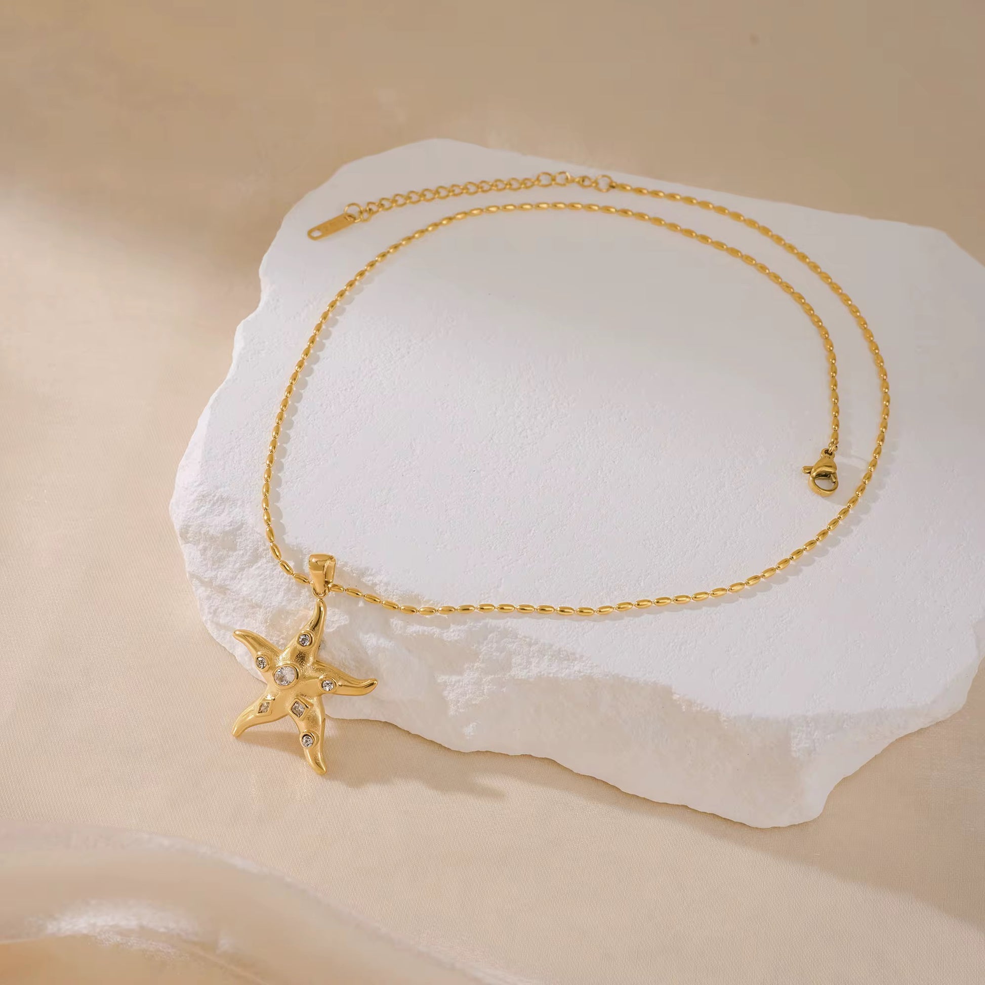 18k gold-plated stainless steel starfish pendant. Hypoallergenic, water-resistant, and tarnish-free with vintage design.