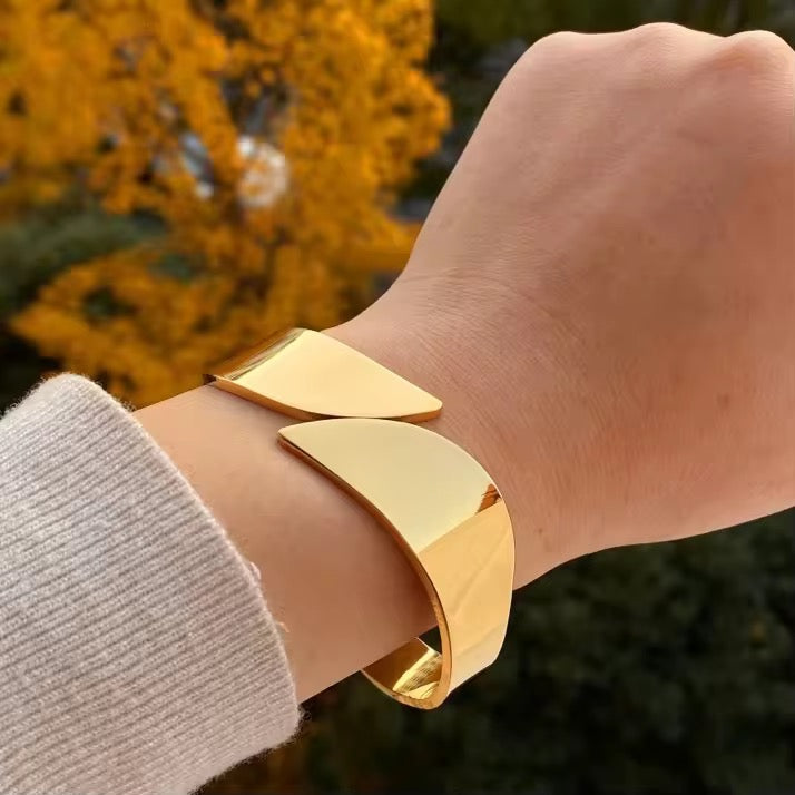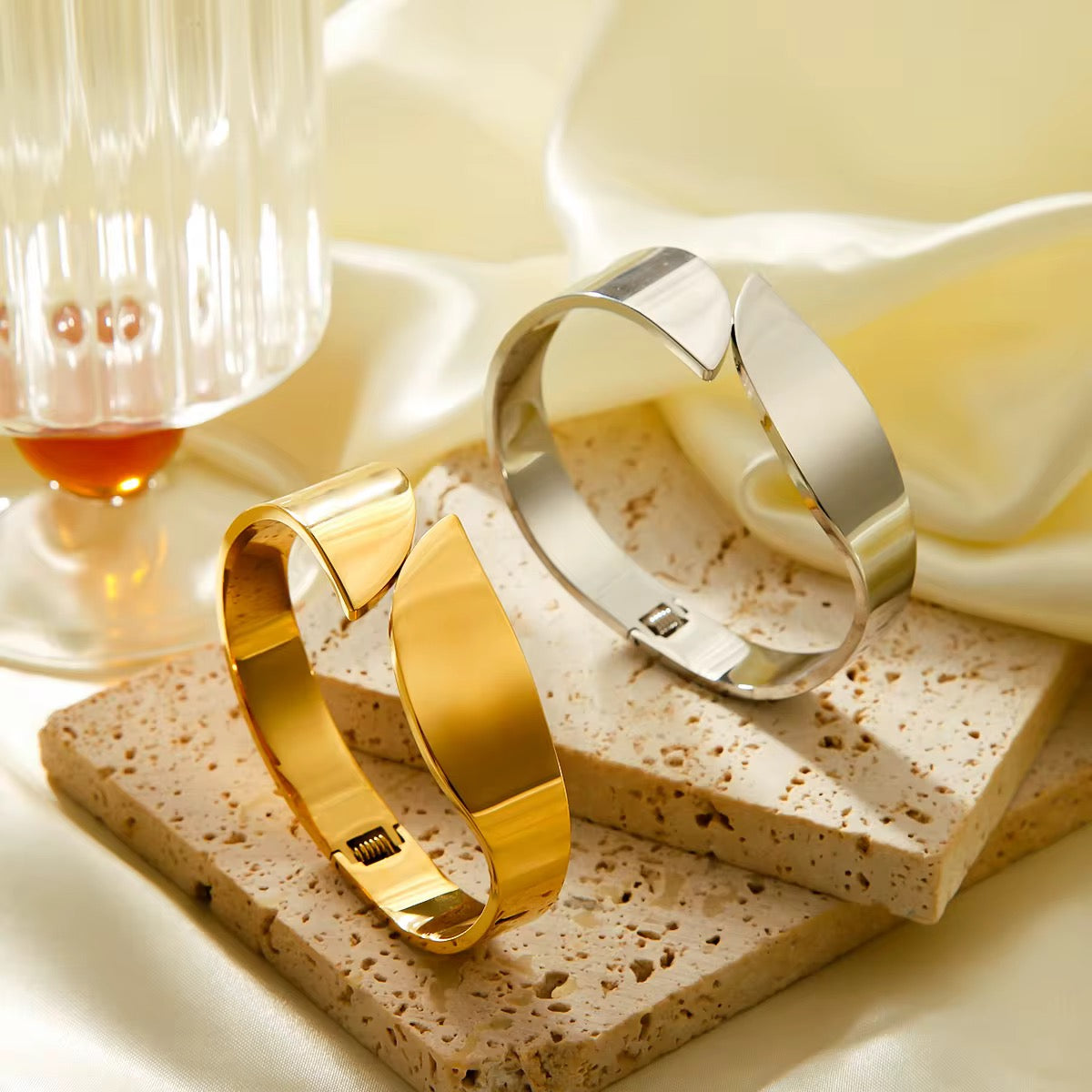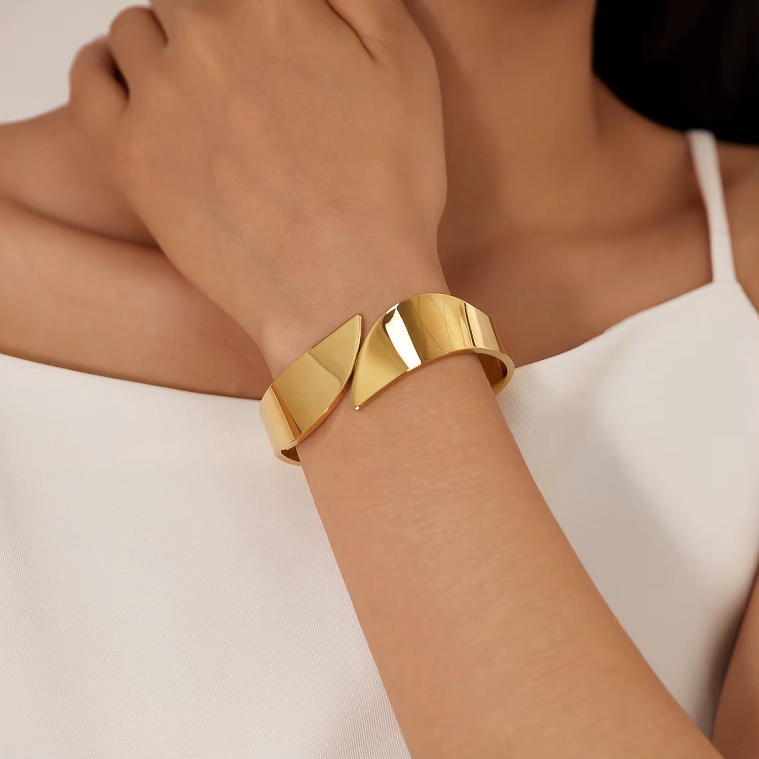 Elegante brazalete Monarca chapado en oro 18k sobre base de acero inoxidable, ofreciendo durabilidad excepcional con apariencia lujosa. Su construcción de alta calidad garantiza resistencia a la corrosión y decoloración, manteniéndose impecable con el uso diario mientras proporciona un acabado sofisticado para cualquier ocasión.