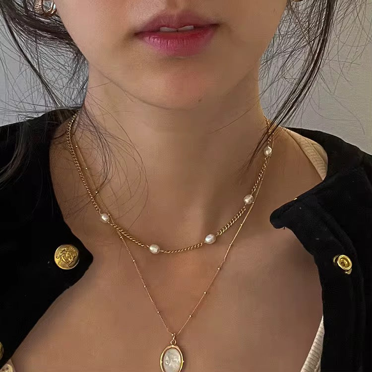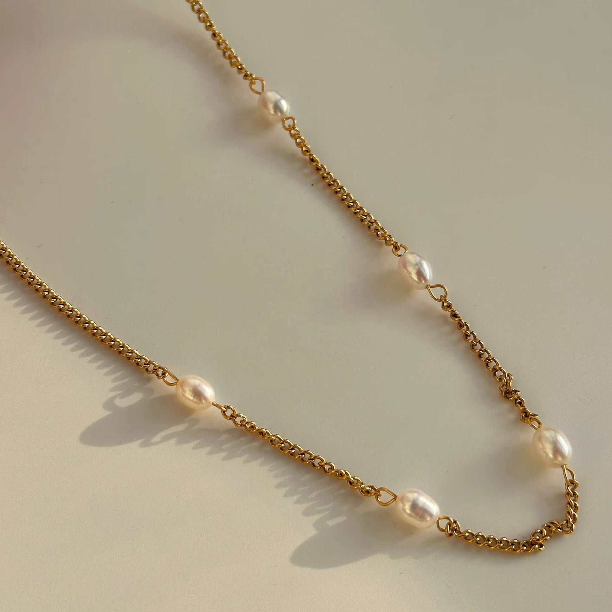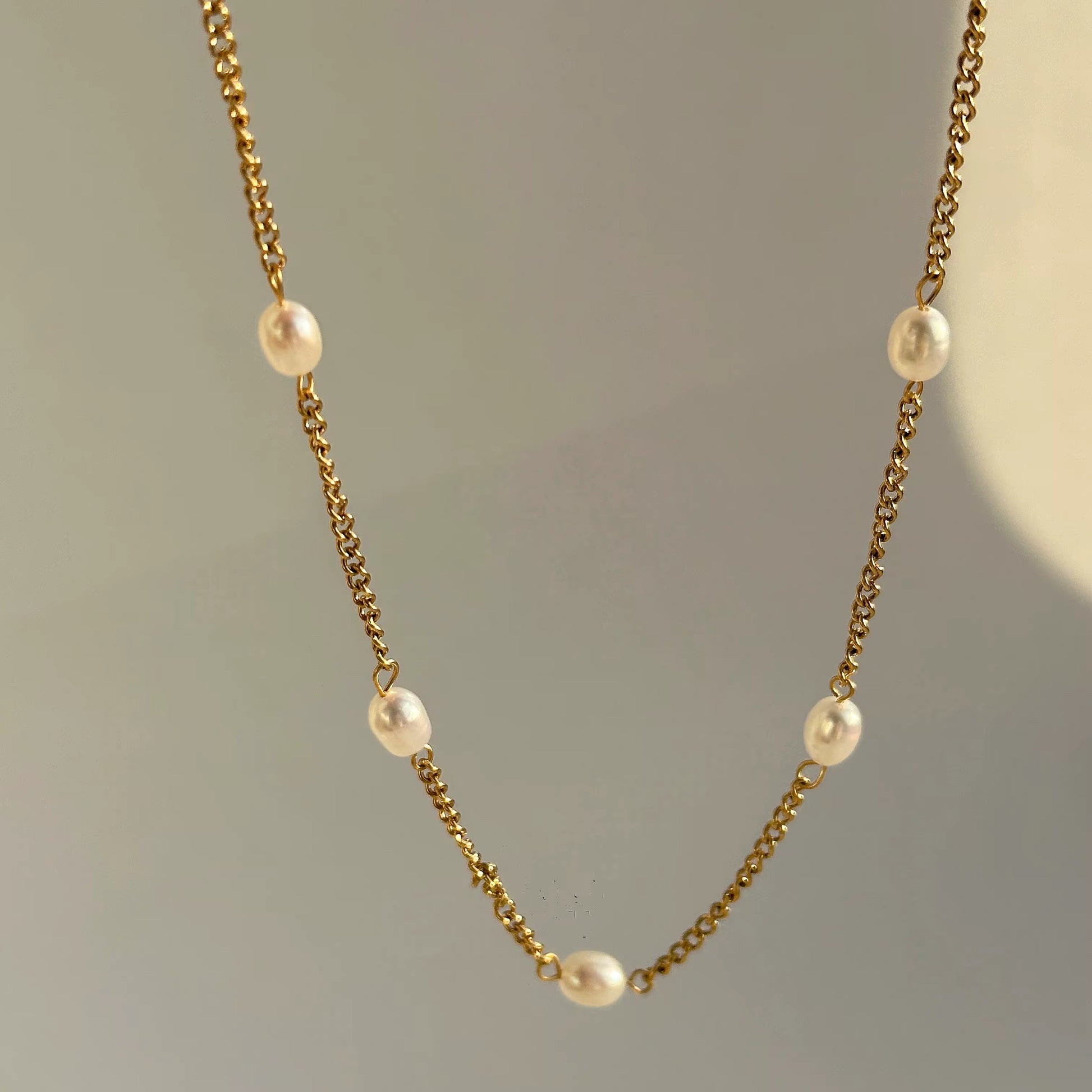 Collar de perla natural de agua dulce con elegante chapado en oro de 18k sobre acero inoxidable. Diseñado para resistir el contacto con agua sin deteriorarse, este accesorio hipoalergénico ofrece sofisticación y durabilidad excepcional, ideal para uso diario sin riesgo de irritaciones cutáneas.