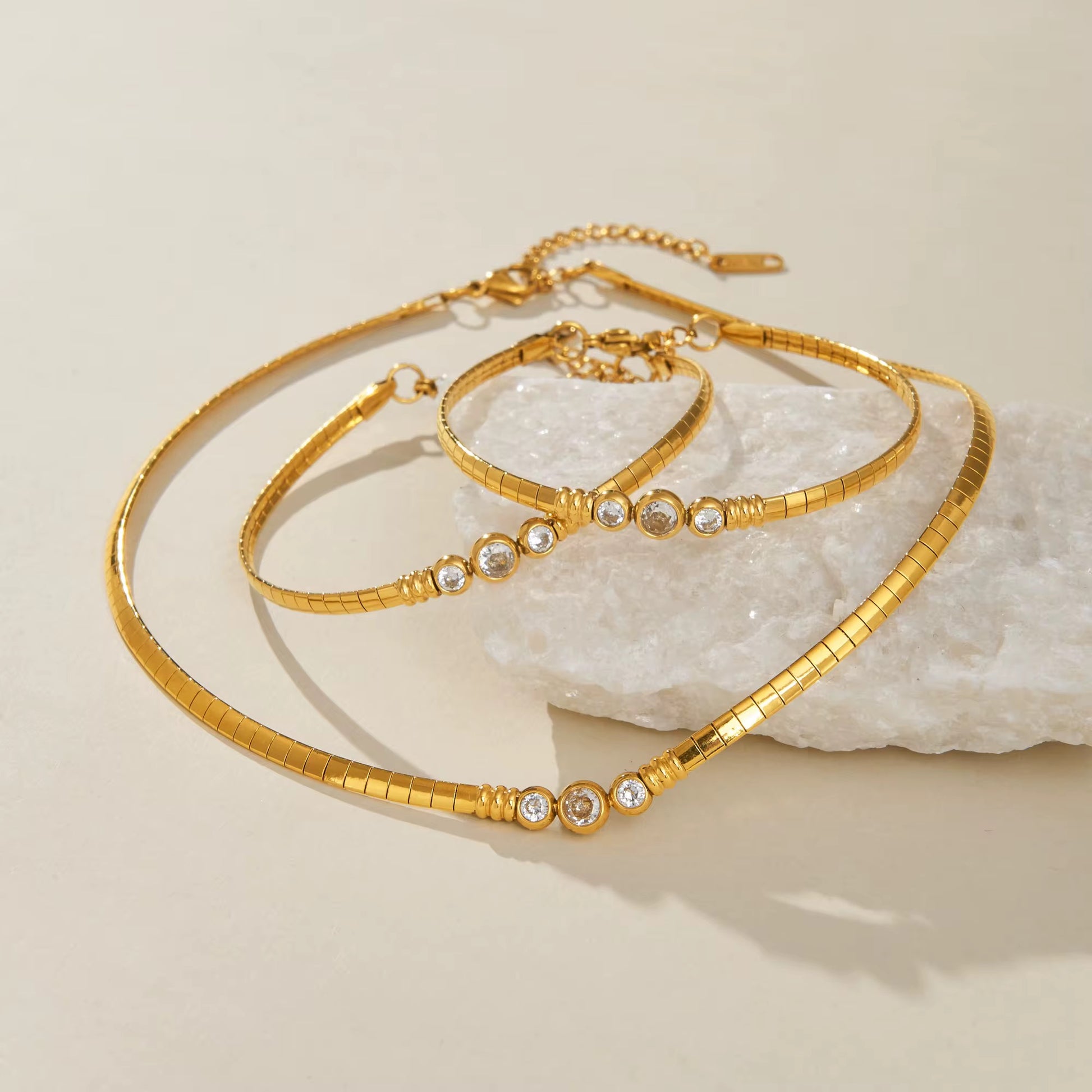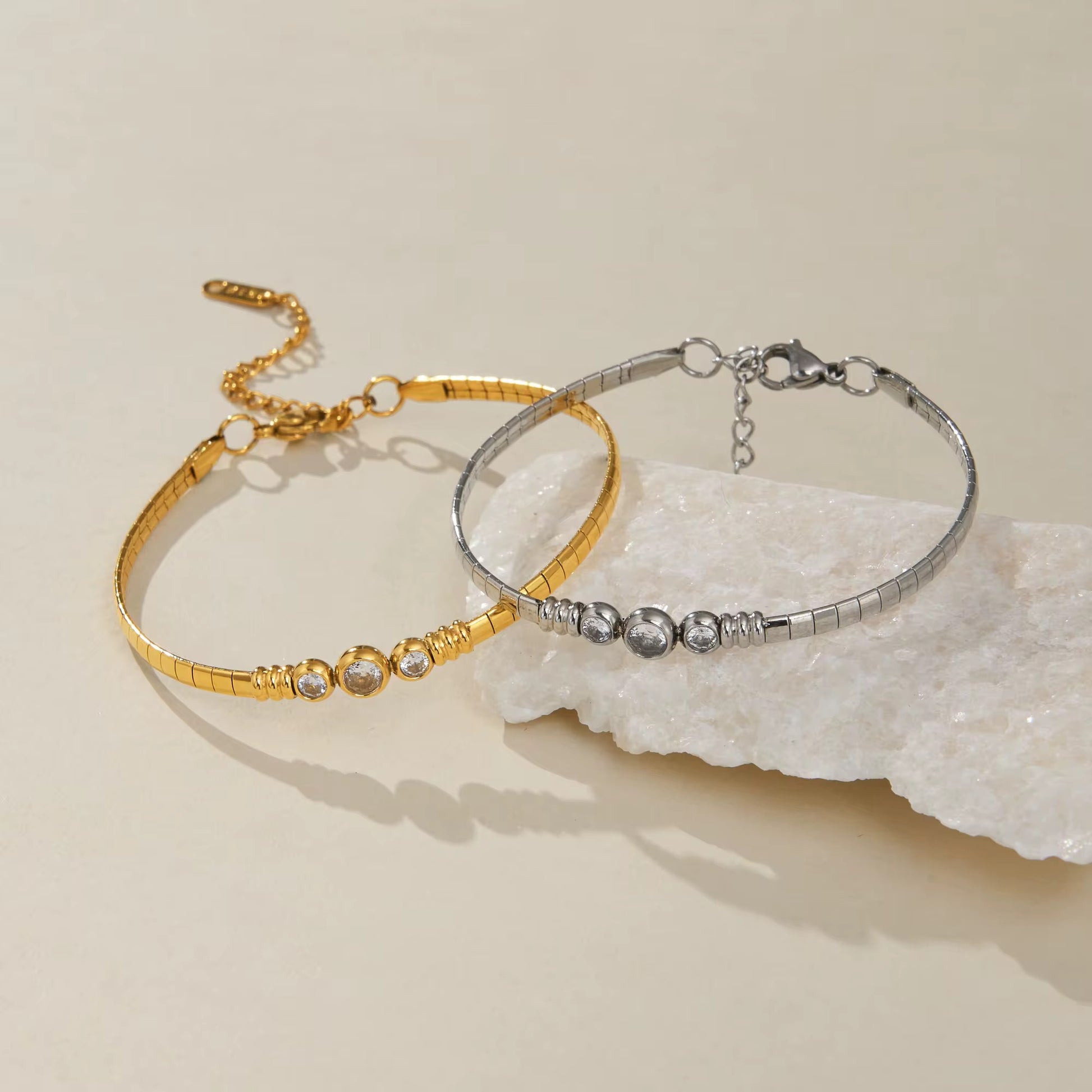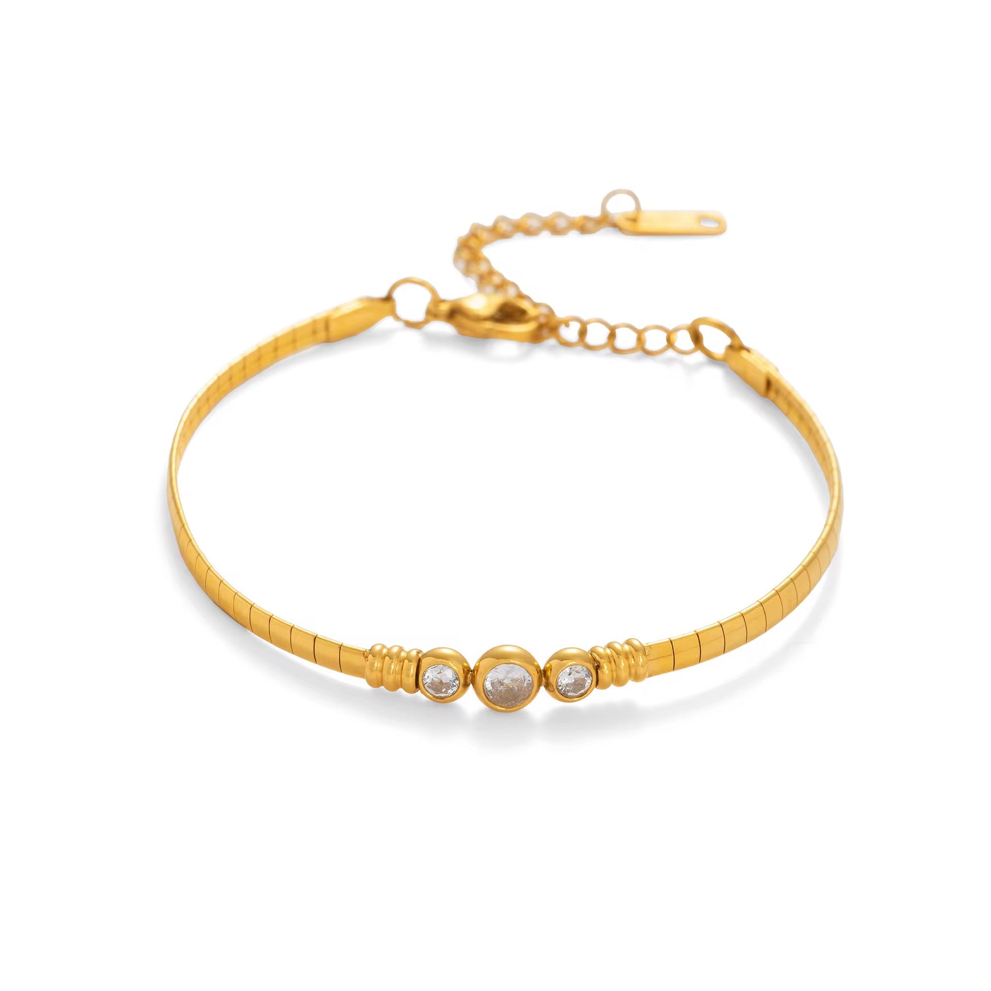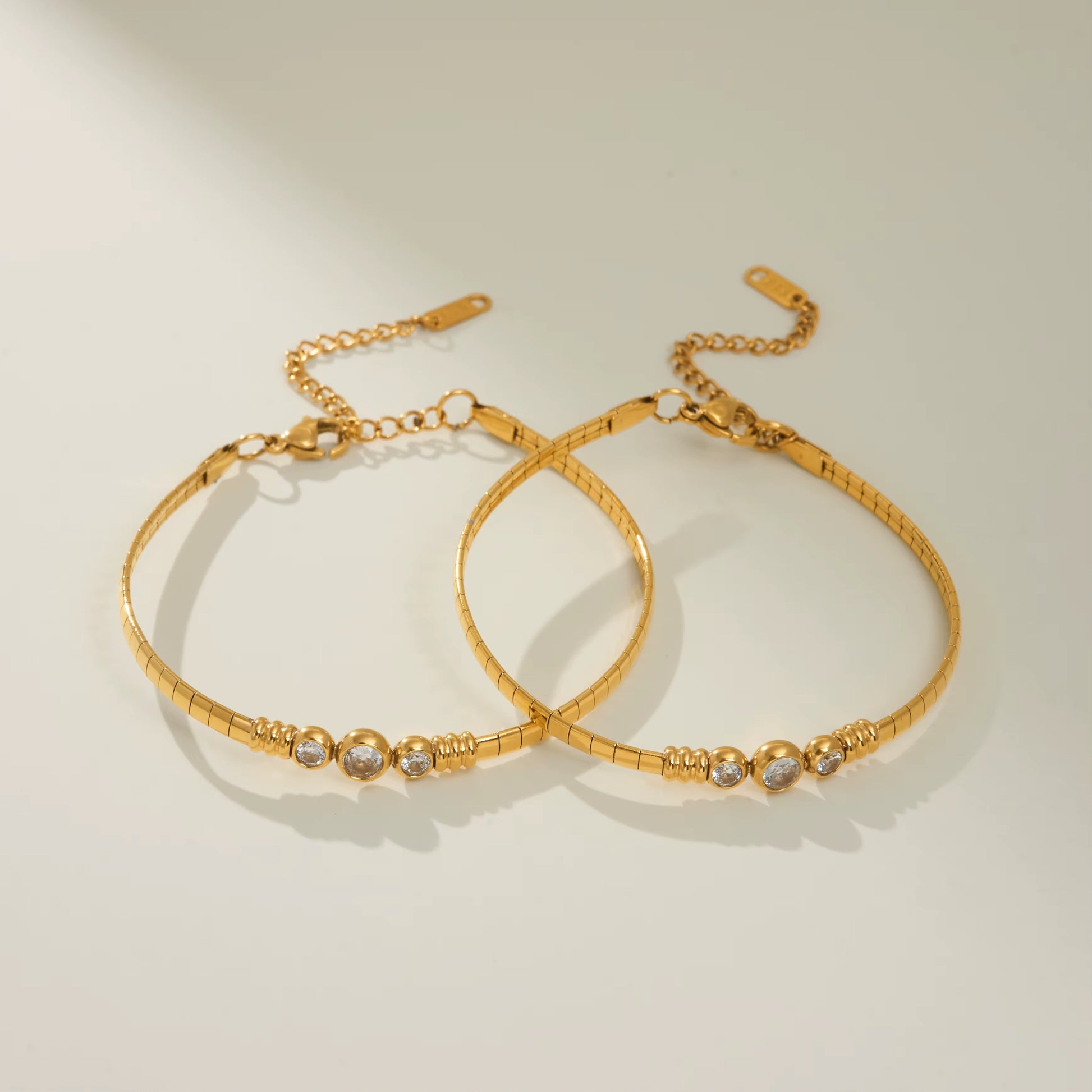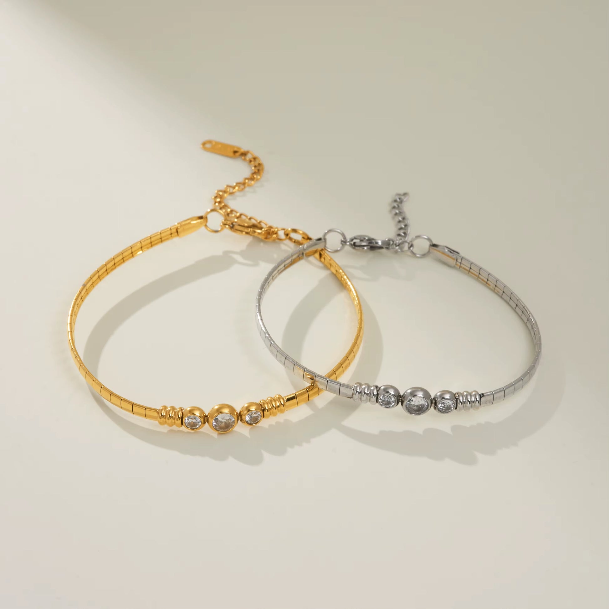 Pulcera Amare, elaborada con acero inoxidable chapado en oro 18k, ofrece un diseño minimalista con detalles de zircón que aportan un brillo sutil. Su construcción resistente garantiza durabilidad mientras mantiene una estética refinada. Ideal para complementar tanto atuendos casuales como formales con un toque de elegancia discreta.