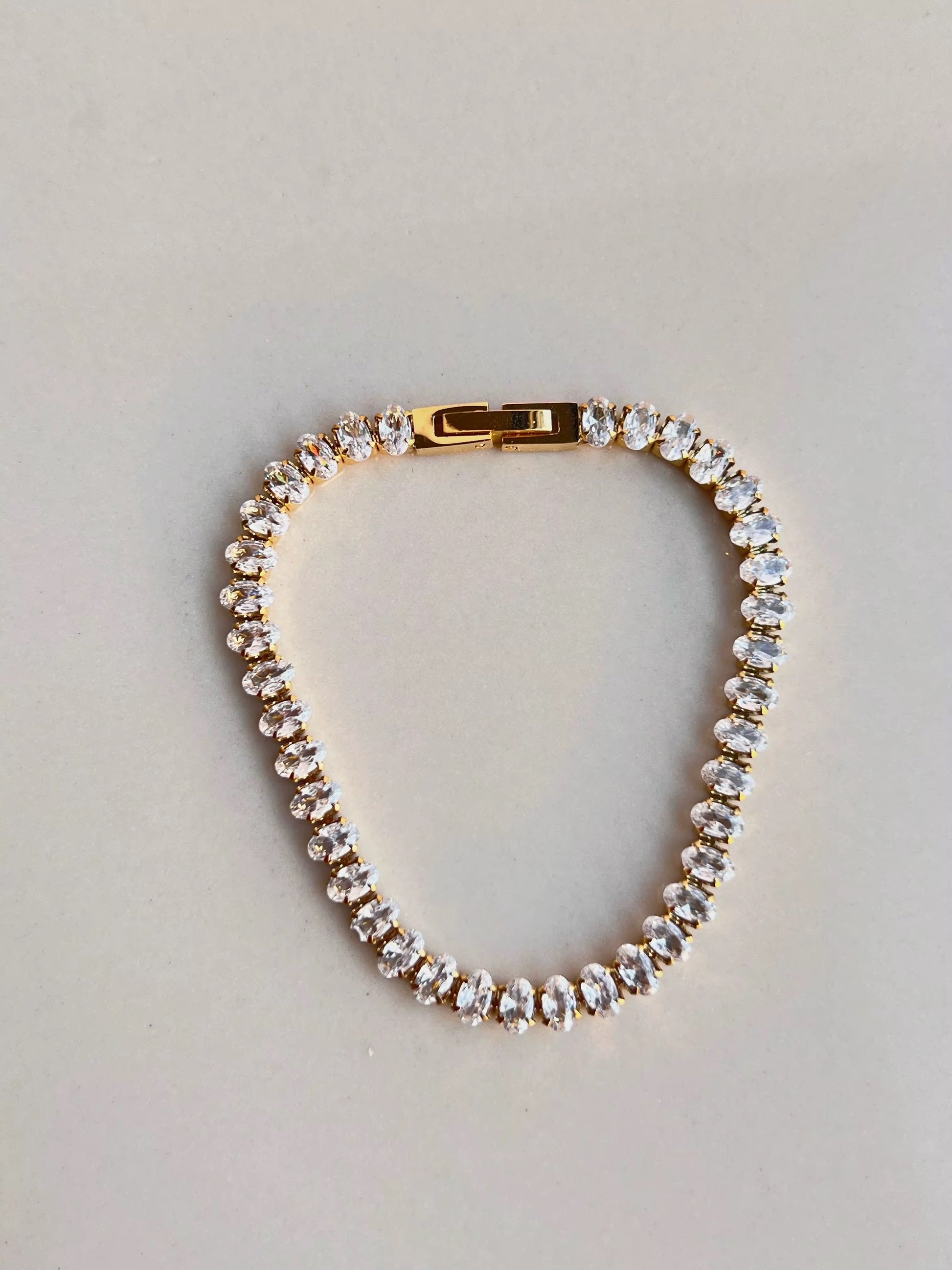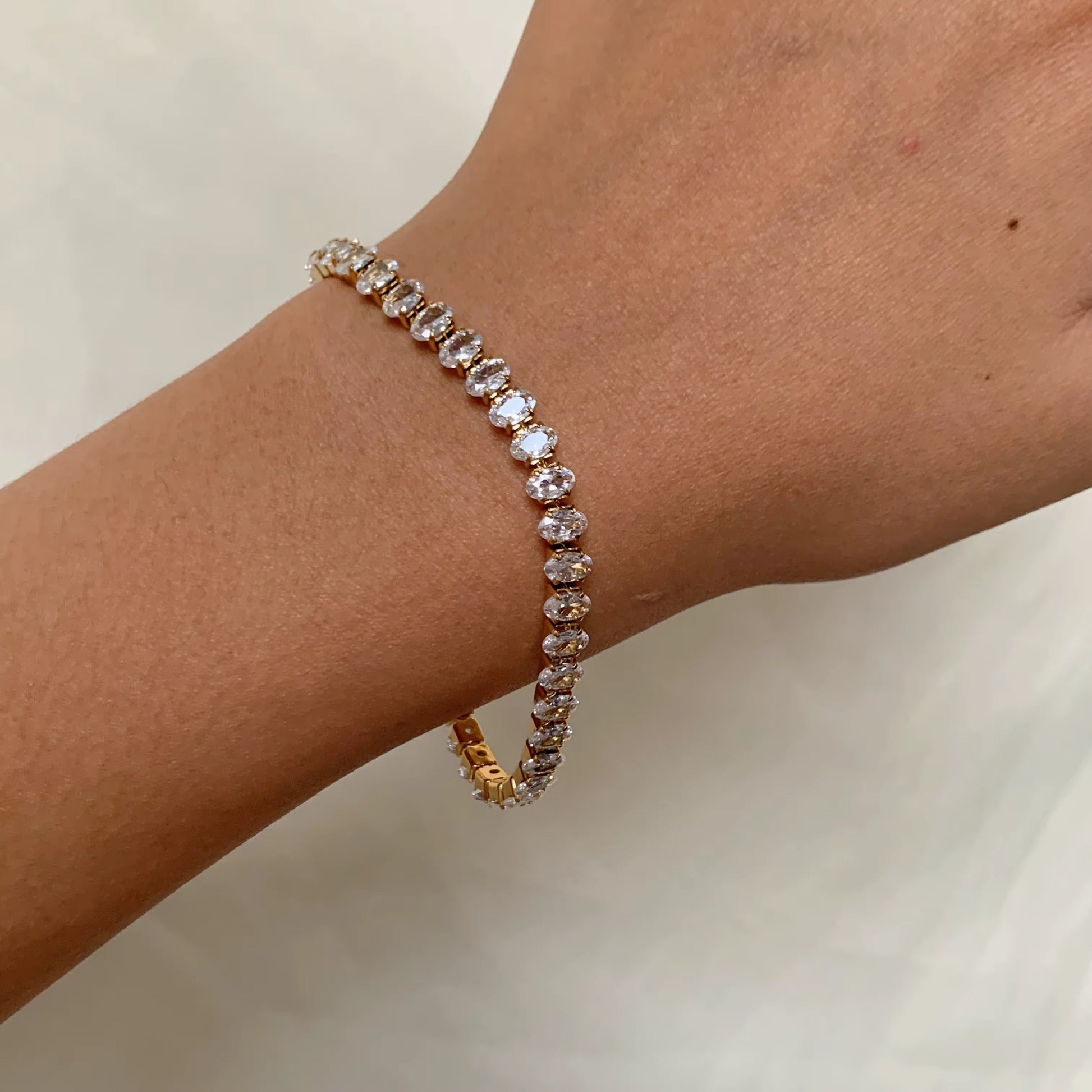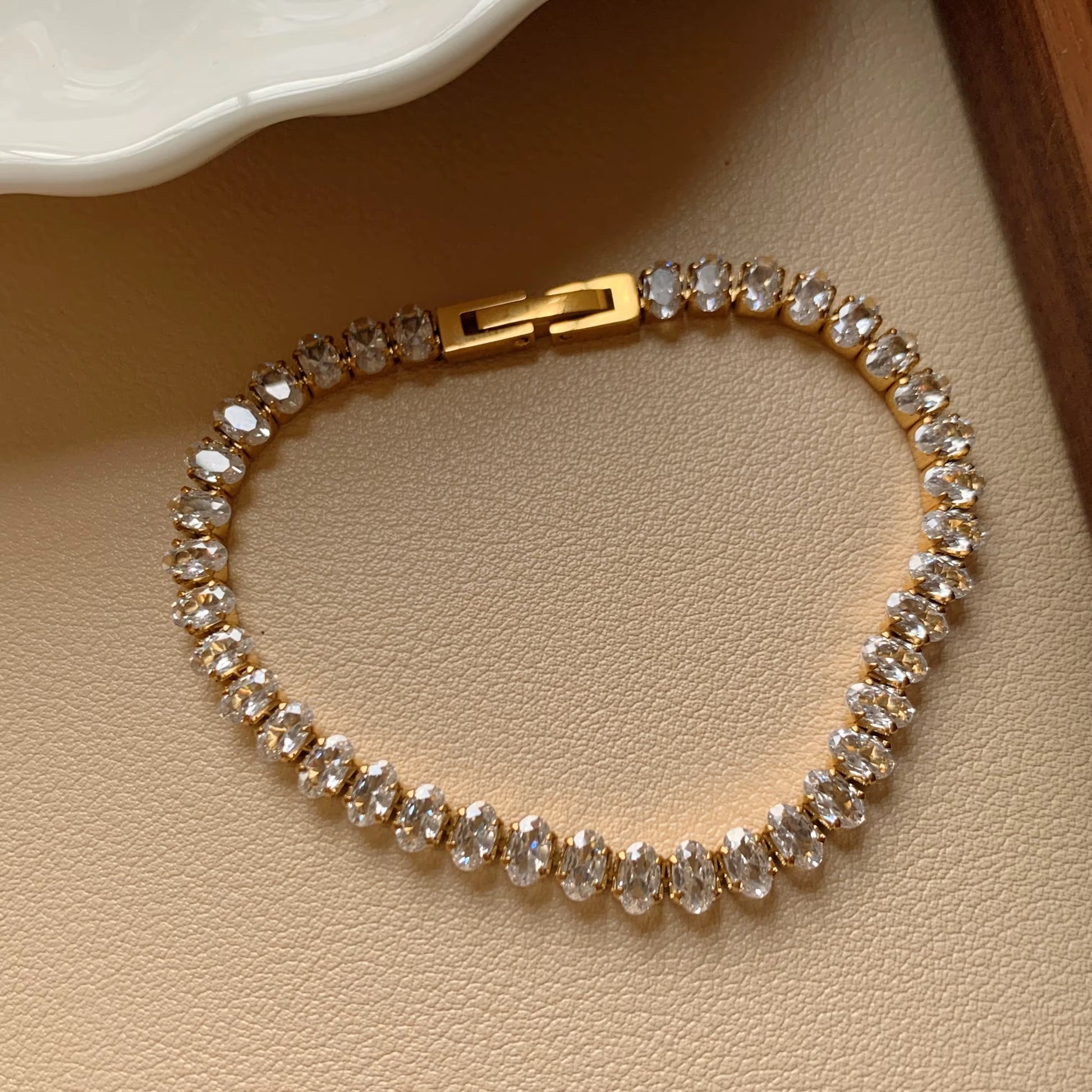 Elegante pulsera de cadena de tenis fabricada en acero inoxidable duradero con chapado en oro de 18k para un brillo sofisticado. Adornada con circonias cúbicas de precisión que capturan y reflejan la luz con intensidad excepcional. Diseño resistente a la corrosión que mantiene su esplendor con el uso diario.