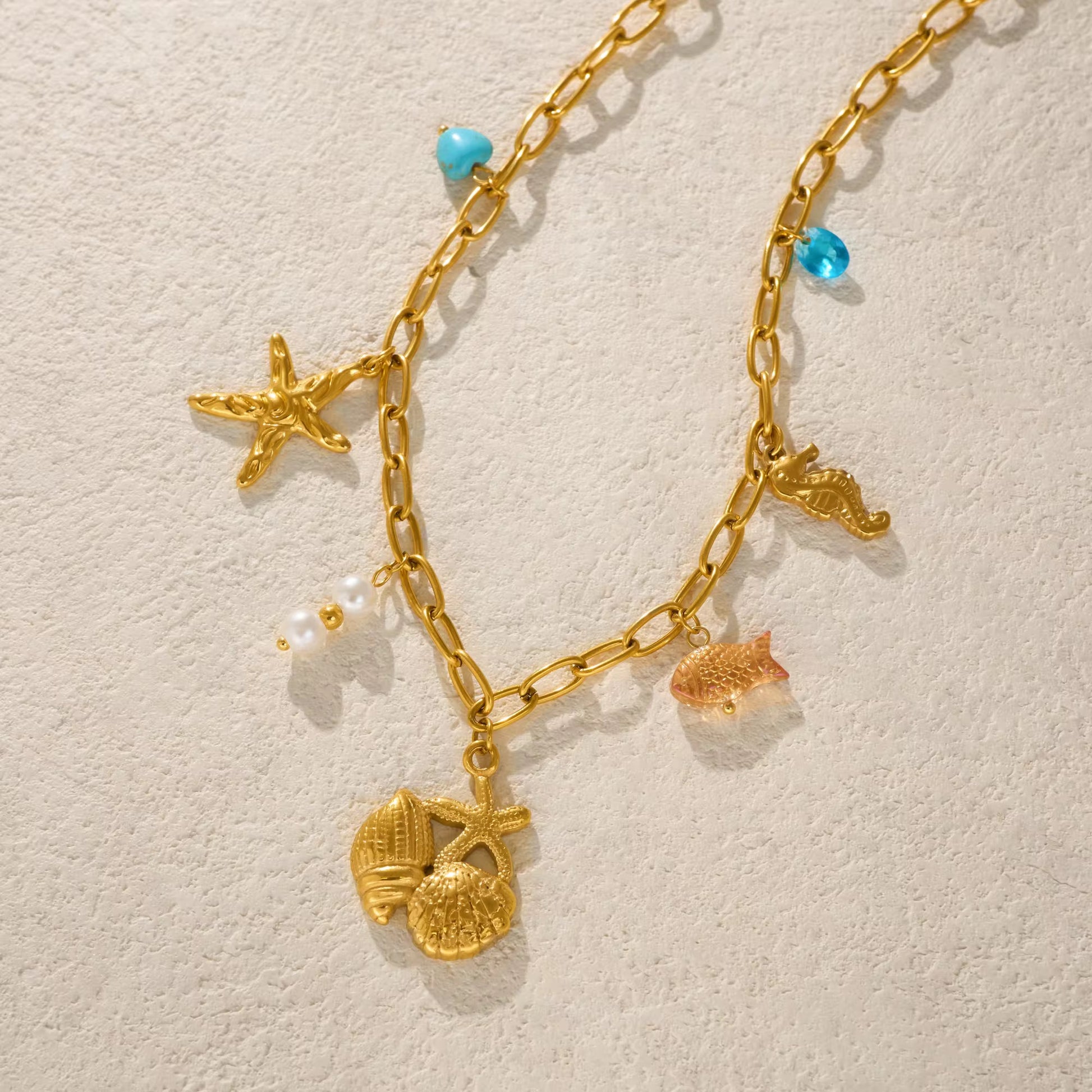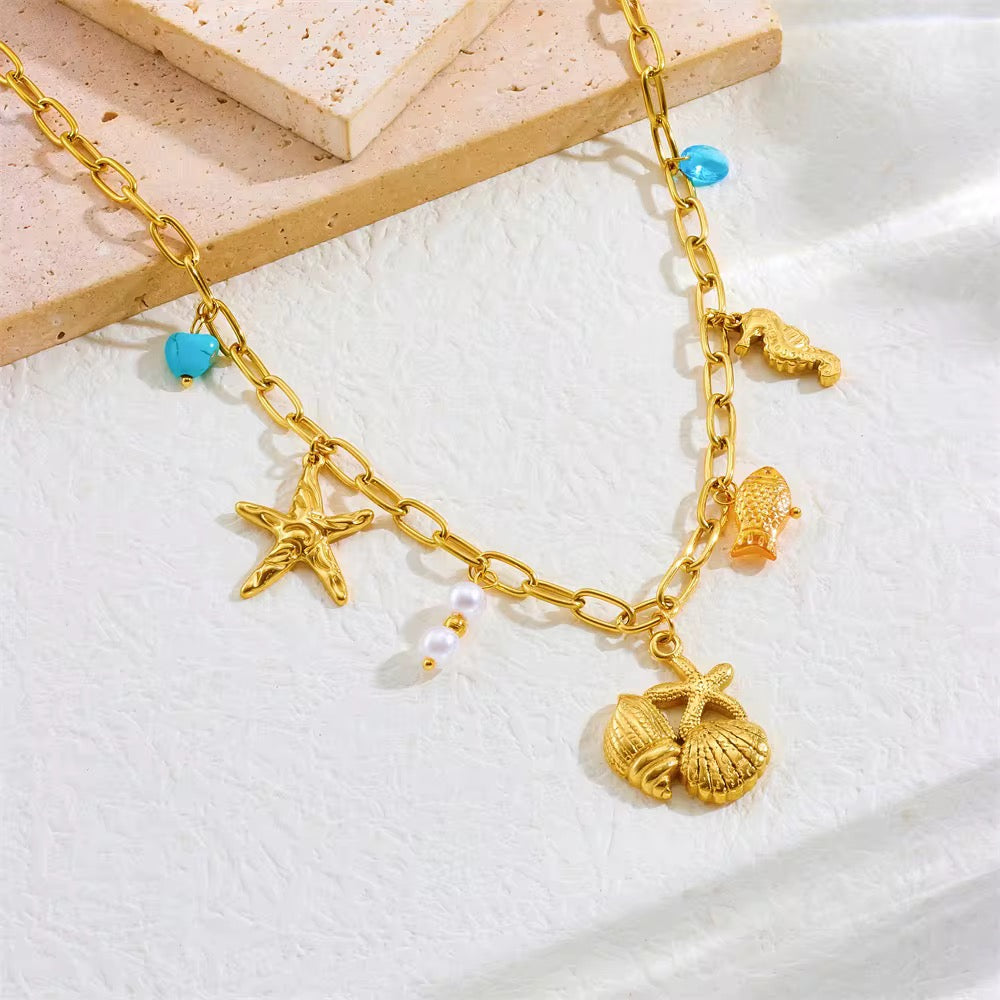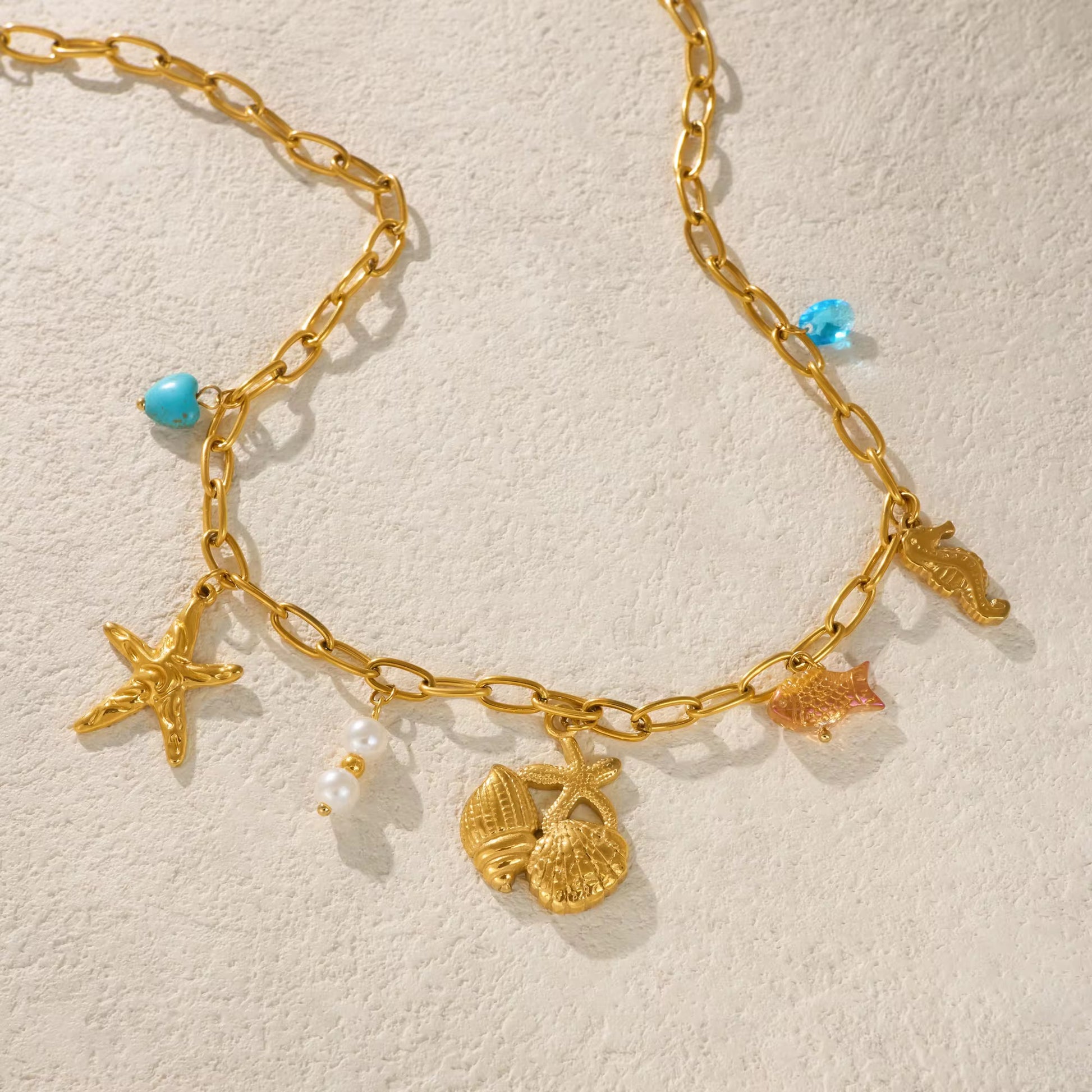 Collar "Sunny" fabricado con acero inoxidable 316 y chapado en oro 18k de alta durabilidad. Su composición hipoalergénica garantiza uso prolongado sin irritaciones cutáneas. Especialmente diseñado para resistir los elementos del verano como sudor, agua salada y rayos UV sin perder su lustre dorado.